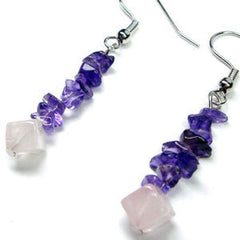 The )Amethyst and Rose Quartz Drop Earrings* is made up of rose quartz bead cubes and amethyst chips beads. These are all strung on transparent cording and attached to a pair of hook earrings