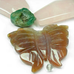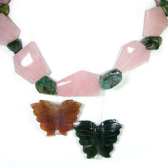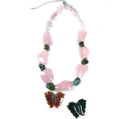The Bloodstone, Rose Quartz & Emerald Necklace features irregular-shaped rose quartz beads as well as chips, rough-cut emerald beads and features two bloodstone crystal butterfly pendants attached to transparent cording. This necklace finishes off with a lobster clasp and a chain is also attached to allow you to choose your desired length.
