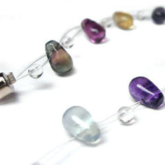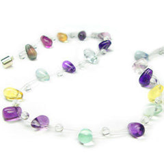 A sweet, delicate and almost transparent necklace, featuring teardrop-shaped fluorite beads, interspersed with clear quartz beads and strung on transparent cording. This necklace finishes off with a magnet clasp for ease when putting it on.