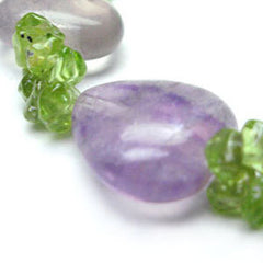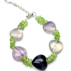 The Peridot and Fluorite Hearts Bracelet, featuring a combination of the green peridot crystal and the purple-hued fluorite, makes a wonderful combination for both the body and soul. It is said that both these crystals are especially good for clear, smooth and blemish-free skin.