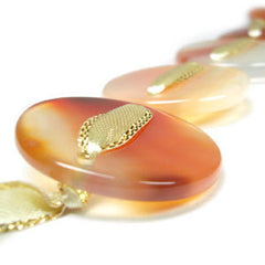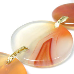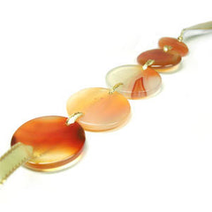 The Ribbon & Carnelian Bracelet is made up of five carnelian crystal disc beads, strung on pretty gold accented ribbon. To put this sweetly feminine bracelet on, simply tie the ribbon ends together.