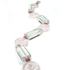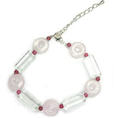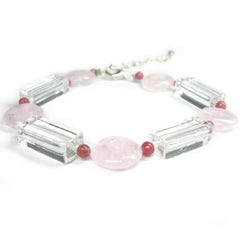 The Rose Quartz, Rhodonite and Rose Quartz Bracelet features petite donut-shaped rose quartz beads, rectangular clear quartz beads and petite spherical rhodonite beads. These are strung on transparent cording and is finished off with a lobster clasp and chain.